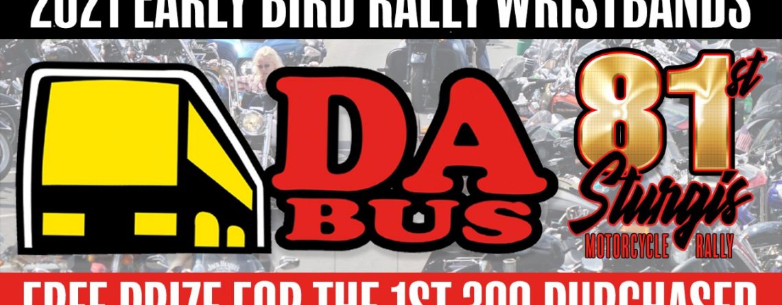 Save 30% with discounted 2021 Da Bus Early Bird Rally wristbands on sale NOW! The first 300 orders will receive a FREE gift! Arrive alive, don’t drink and ride, let us take you to and from your favorite pick up and destination points during the 81st Annual Sturgis Motorcycle Rally. Serving all of Sturgis, Deadwood, Whitewood and Spearfish. See you soon! CLICK HERE FOR WRISTBANDS
