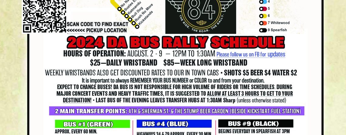Welcome to the 85th Annual Sturgis Motorcycle Rally. Our scheduled routes will be operating Aug. 1 – Aug. 8. You can find all route information by clicking here. Be sure to use the QR code at the bottom of the Rally Schedule if you are unsure where your bus stop is. You can buy your weekly or daily wristbands from your driver at pickup or from our hubs at The Stump as well as 4th and Sherman shown on [...]
