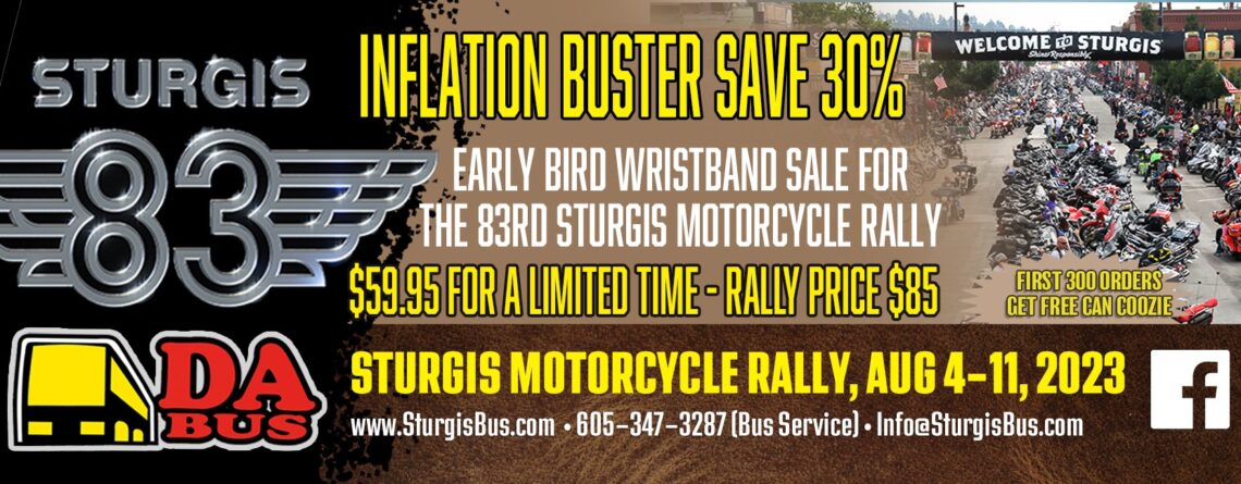 LAST CHANCE INFLATION BUSTER SAVINGS – 30% OFF 2023 Da Bus Inflation Buster wristbands for UNLIMITED bus transportation during the Rally! Arrive alive, don’t drink and ride, let us take you to and from your favorite destination points during the 83rd Annual Sturgis Motorcycle Rally. Da Bus routes run Aug 4-11, 2023. Serving all of Sturgis, Deadwood, Whitewood and Spearfish. www.sturgisbus.com/2023-rally-wristbands/