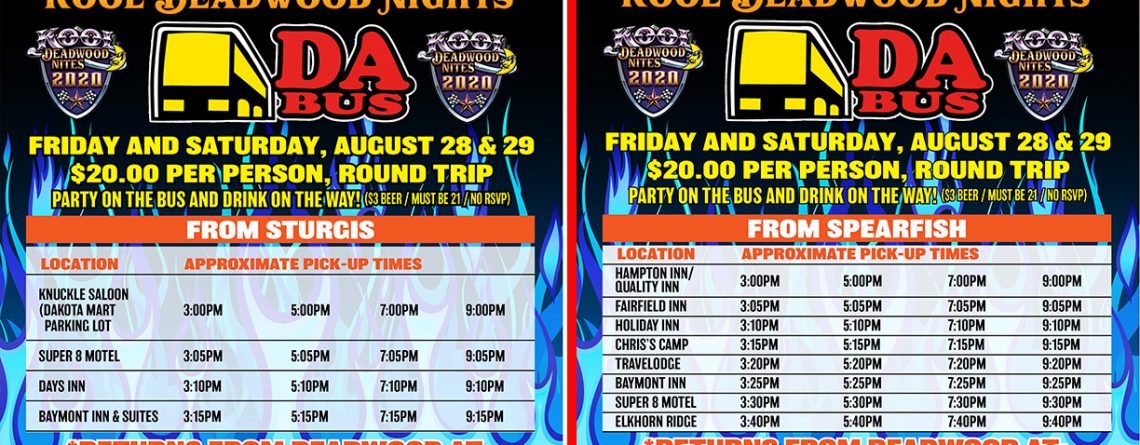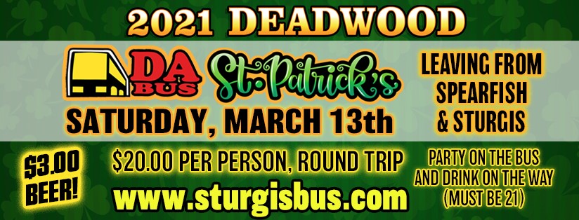 Jump on Da Bus Saturday March 13 and head to Deadwood for the annual St Patty’s day celebration. We will be running from both Sturgis and Spearfish in time to catch the parade and the festivities. Click post to see schedules for both routes. Please party safe and responsibly and we will see you soon!