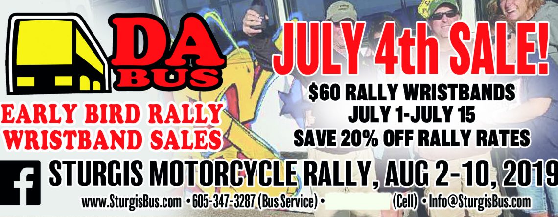 JULY 4TH SALE SAVE 20% sturgis2020-05-11T12:47:24-07:00 Save 20% on Da Bus week long wristbands with the July 4th sale. Take advantage of the savings and pick up your wristbands when you arrive. Clink the link to purchase now. July 4th Sale