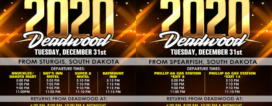 Please join us December 31, 2019 while celebrating the ringing in of the New Year. Please celebrate safely, responsibly and arrive alive. Leslie and Desiree will be out all Tuesday night with Da Buses transporting to and from both Sturgis and Spearfish to Deadwood . Please see attached schedule for details. See you soon!